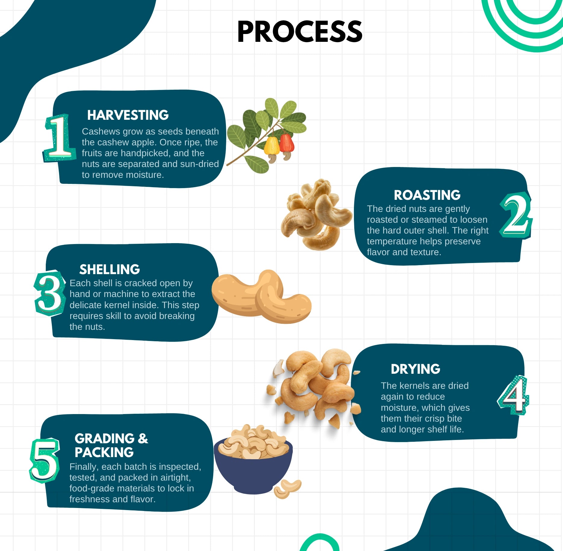 Our team ensures every cashew is carefully graded, cleaned, and packed under strict supervision. We take pride in offering only three products — Cashew, Broken Cashew, and Premium Cashew — each representing a level of excellence for every taste and occasion.